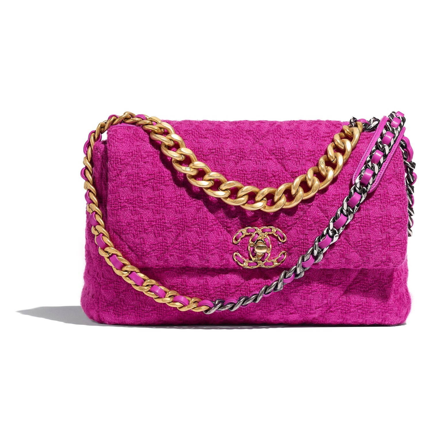 「CHANEL 19」は、3つのサイズ展開からなるこの長方形のフラップバッグ。素材には、大きなダイヤモンドシェイプのキルティングを施したレザーやツイードを使用しており、レザーを編み込んだメタルチェーンには、