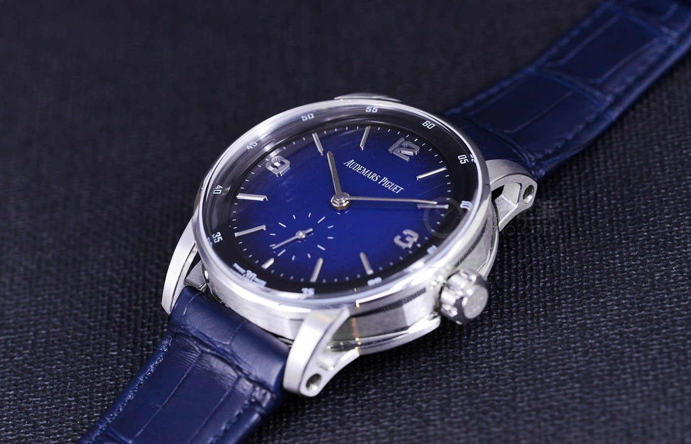 スモークブルーエナメルダイヤルには、ホワイトゴールドの針、立体的な象眼細工のアワーマーカー、オーデマピゲロゴが組み合わされています。青いディスクの表面は、浅い海から深い海に変わるにつれて、中央から外側に向かって徐々に深くなります。スモールセコンドは6時位置に設定されています。